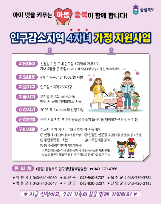✅ 충북도, 전국 최초 ‘4자녀 가정 지원사업’ 시행! 인구감소지역 가구에 연 100만 원 지원