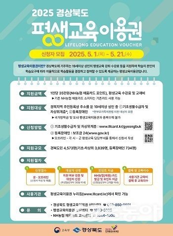 영덕군이 관내 취약계층을 대상으로 1인당 최대 35만 원까지 지원하는 평생교육 이용권 지원사업을 시행합니다.
