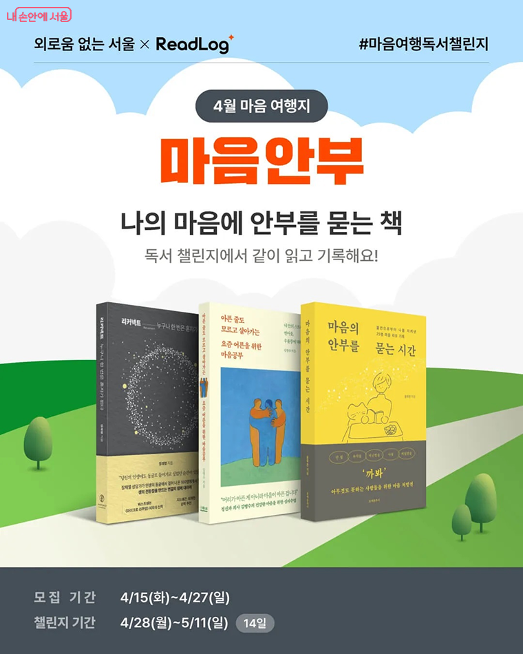 서울시가 교보문고와 함께 마음의 안부를 묻는 특별한 독서 프로젝트, ‘마음여행 독서챌린지’를 시작합니다. 이 챌린지는 혼자 있는 시간을 의미 있게 보내고 싶은 사람, 책 속에서 위로받고 싶은 사람, 그리고 일상 속에서 따뜻한 공감이 필요한 모든 시민을 위한 프로그램입니다.